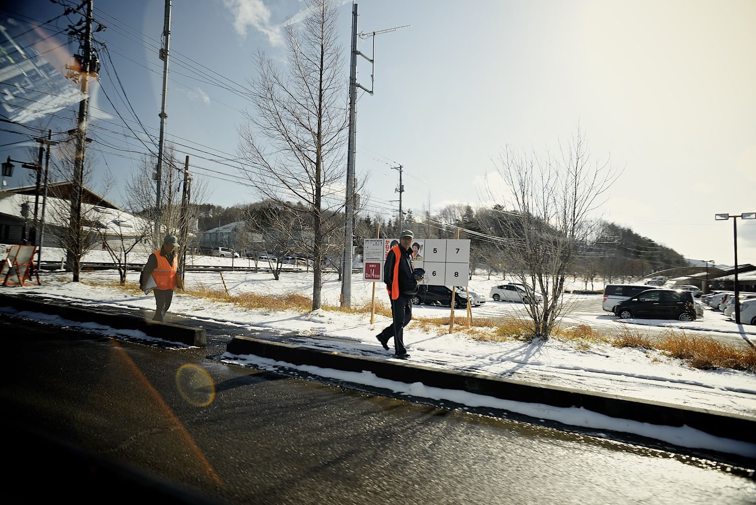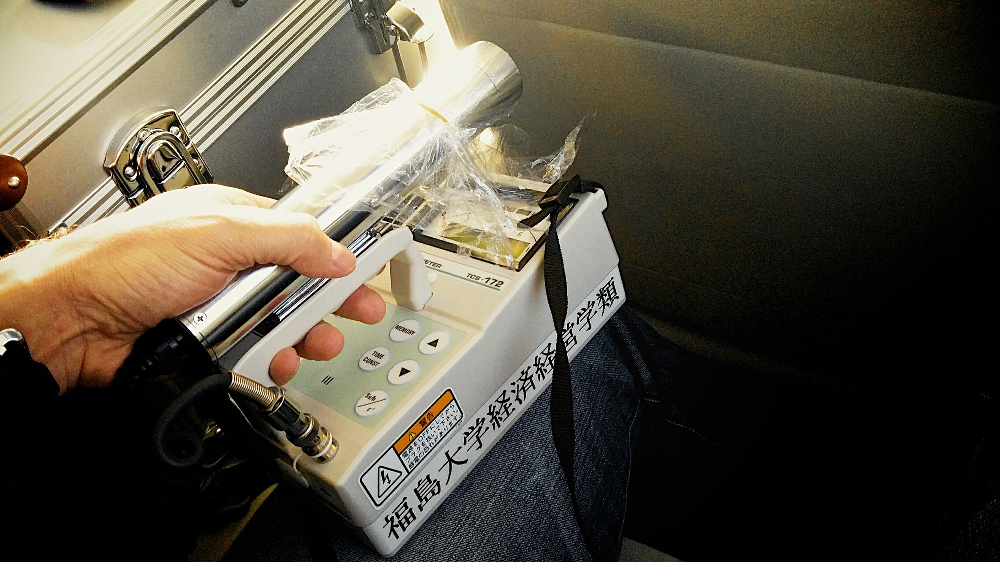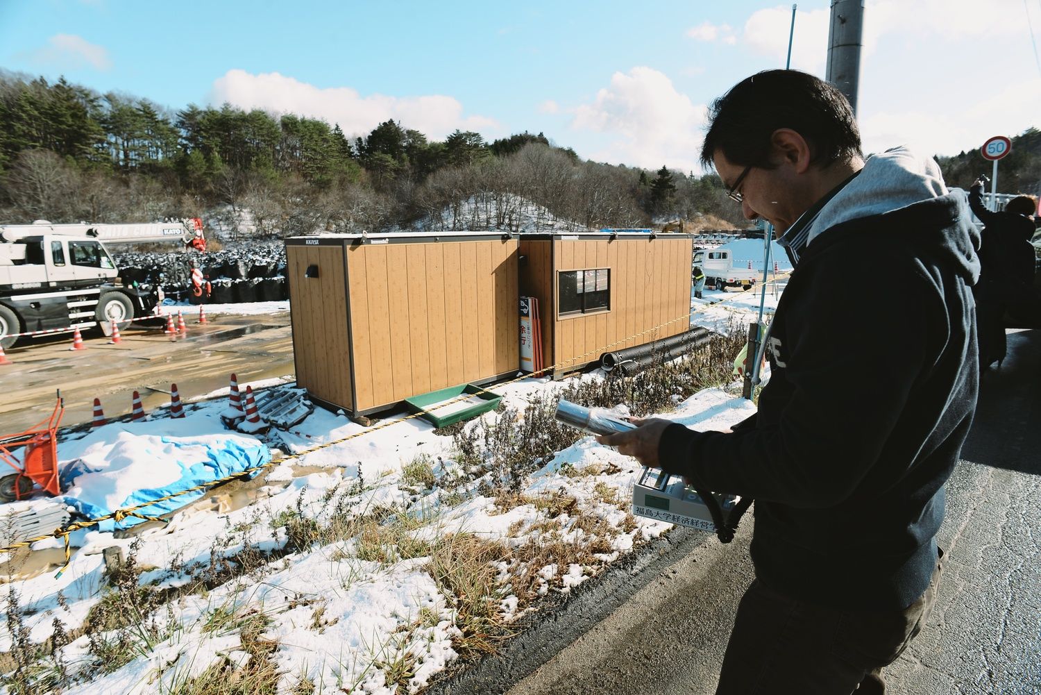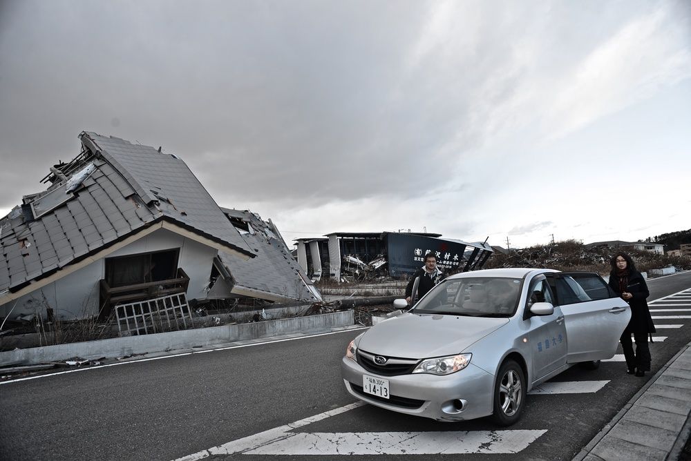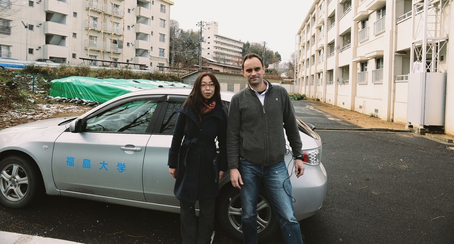 We rush into the car in the colors of Fukushima University. It will allow us to enter restricted access areas.